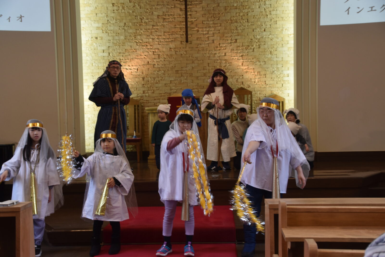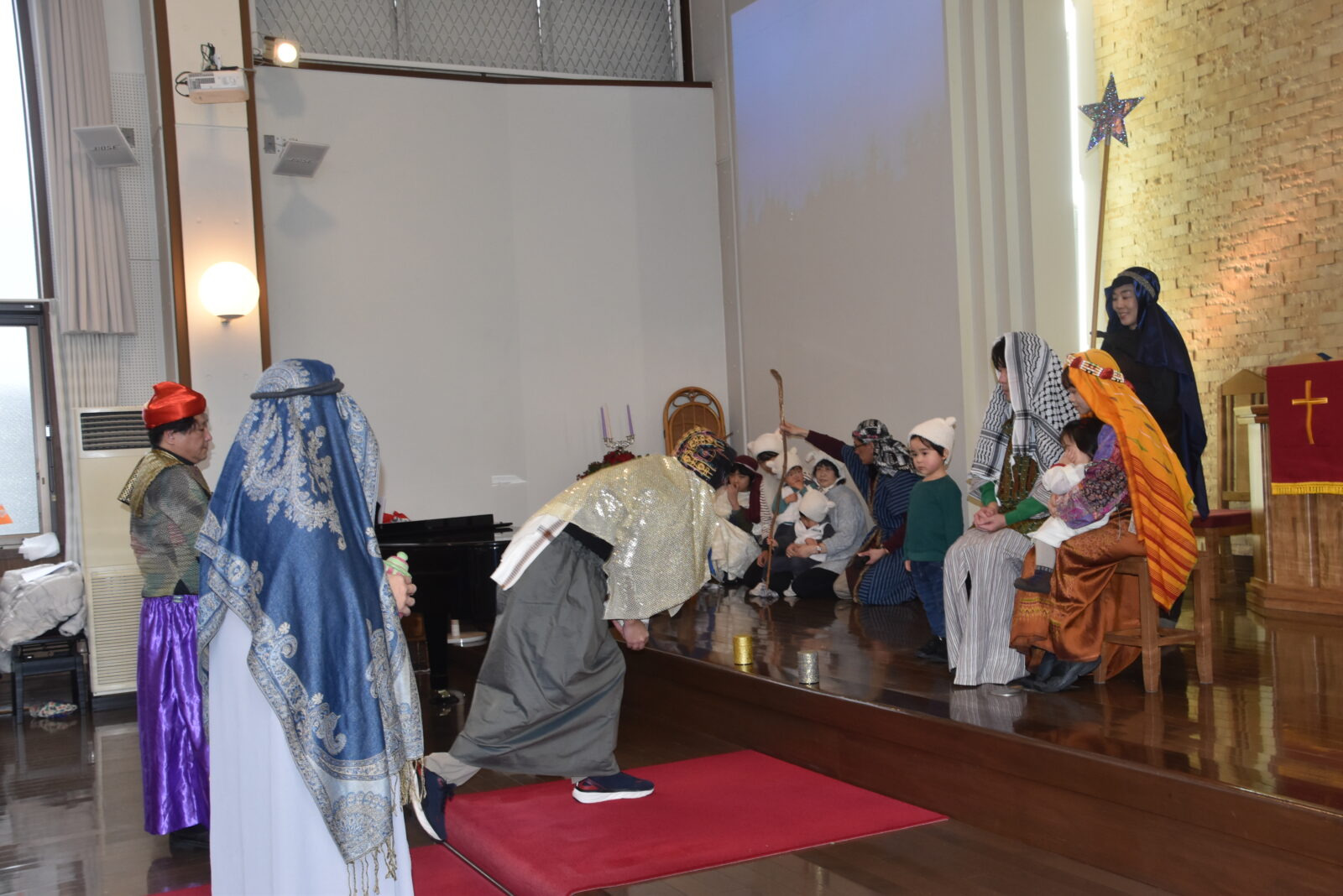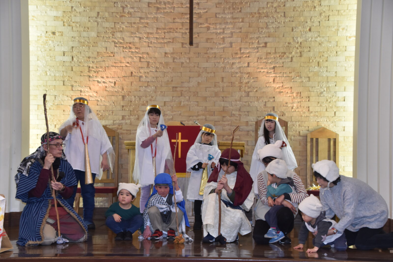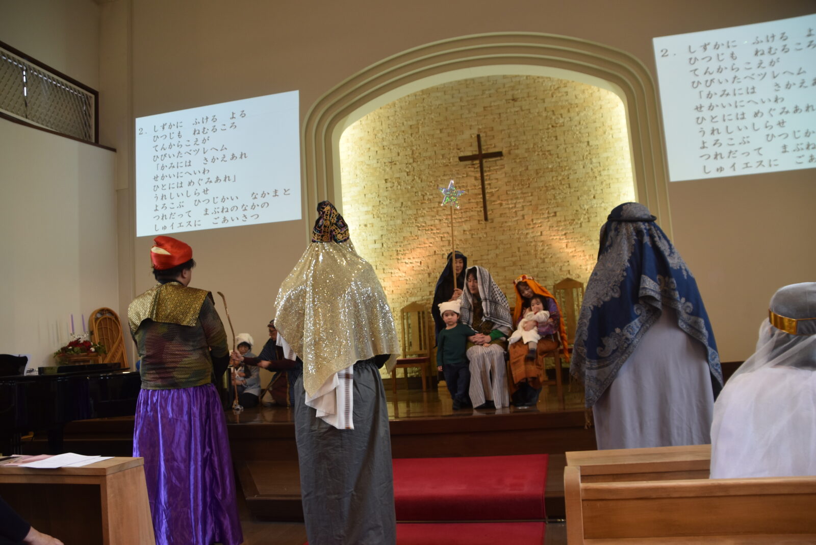 今日は、待降節第三主日礼拝。アドベントクランツには、教会学校の子どもたちによって3本目のろうそくに光が灯されました。 礼拝後には、キリストの降誕を祝う「ページェント」(降誕劇)が行なわれました。教会学校の子どもたちを中心に大人たちもいろいろな役に就き、また会堂の全員が合唱に加わることで全員参加のページェントを創り上げることができました。このページェントを通して、御子イエス様のご降誕の出来事を深く心に留めることができました。