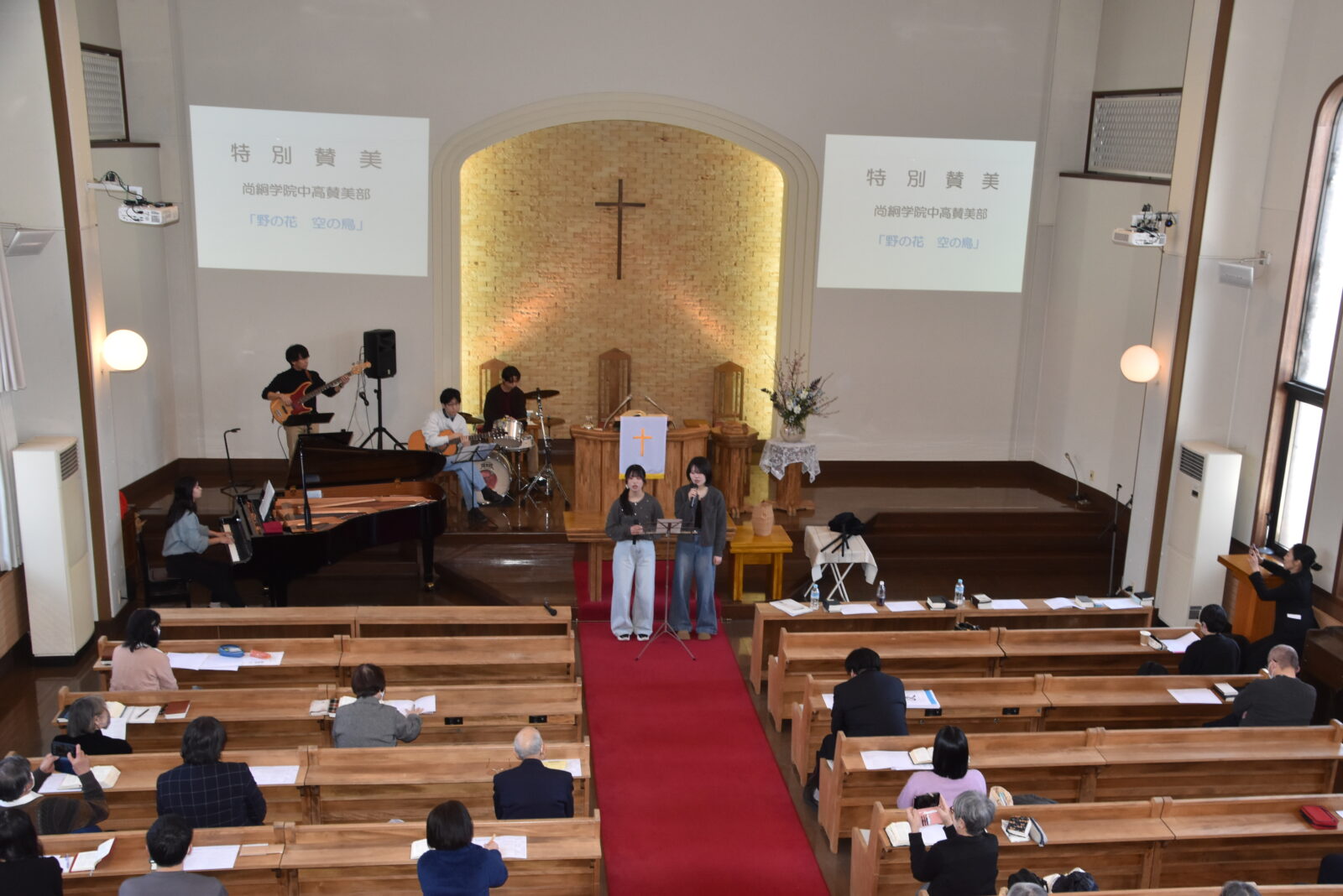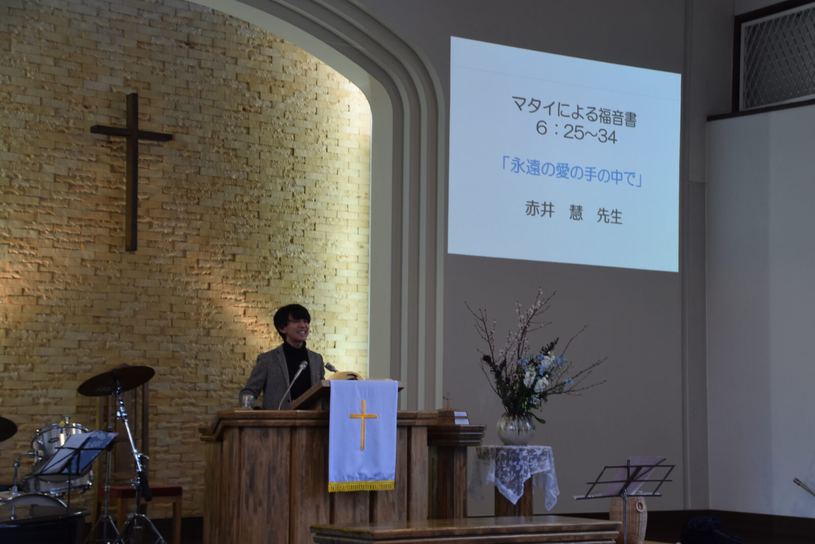 1月18日(日)は「仙台青葉荘教会 オープンチャーチ」が行なわれました。1日教会を開放して、初めての方にも教会に親しんでもらおうという試みで、当教会としては昨年に続き2回目の試みです。午前中の礼拝は特別伝道礼拝として、牧師であり尚絅学院中学高等学校の聖書科の教諭でもある赤井慧先生に「永遠の愛の手の中で」と題して説教をしていただきました。それに続いて尚絅学院中高賛美部P.S.T.(Praise Songs Team)がオリジナル曲「野の花 空の鳥」を特別賛美しました。礼拝後は、2階の集会室で、皆で美味しい味噌仕立ての芋煮とご飯を頂きました。その後は礼拝堂に戻り、野々川康弘牧師が講師を務め「バイブルワークショップ」を行ないました。テーマは「神の愛を実践する聴き方」。この時に行われたグループワークを通して、互いに相手を肯定的に捉える神様の愛に根差したコミュニケーションの取り方を学ぶことができました。今日のオープンチャーチには初めて当教会に来た方も多くいて、神様の下で豊かな交わりを持つことができました。
