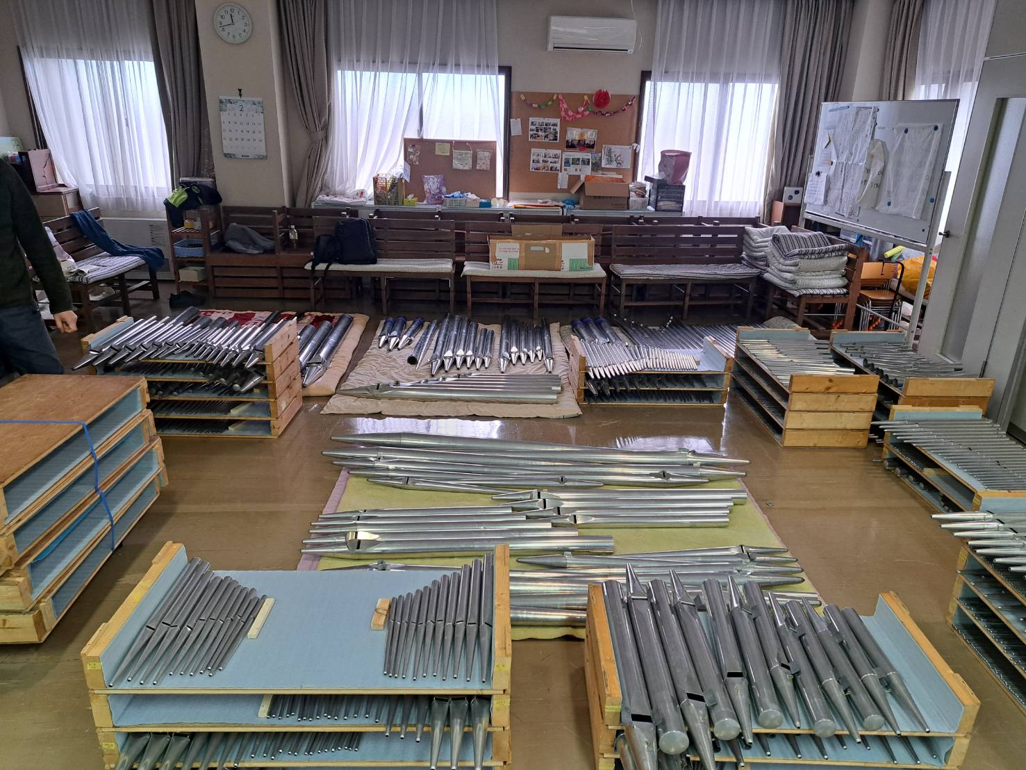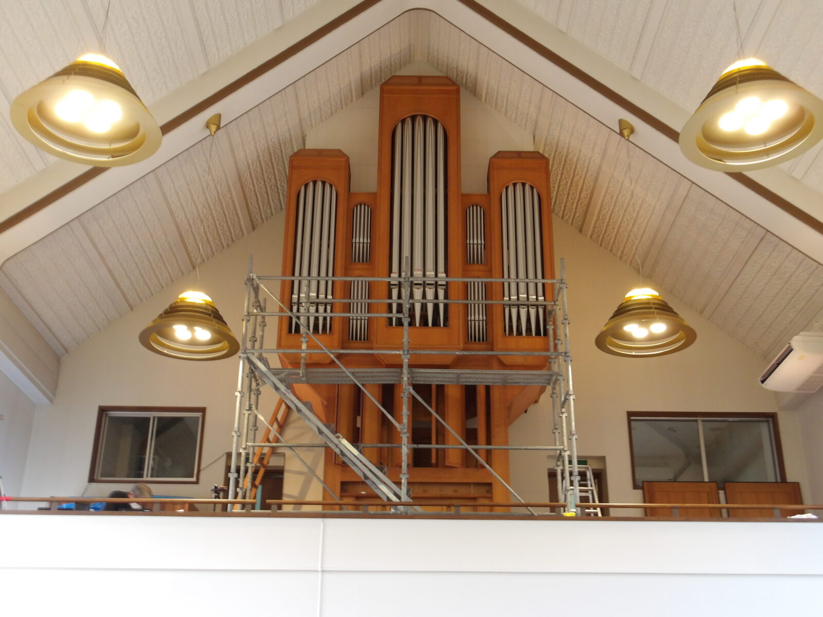 2月のはじめから2週間にわたって行われていたパイプオルガンのオーバーホールが完了しました。オーバーホールとは、機械製品を部品単位まで分解し、清掃や修理、部品交換を行って、新品時の性能状態に戻す作業のことです。当教会のパイプオルガンは、1990年1月に現在の会堂が完成した後、1991年12月に設置されました。ドイツのヤン社から購入したものです。設置から約35年が経過していました。今日の礼拝では、新しく生まれ変わったパイプオルガンの重厚な音色が会堂に響き渡りました。また、先週の礼拝ではパイプオルガンが使えなかったため、足踏みのベビーオルガンが奏楽に使われました。このオルガンは、戦後の復興時から旧会堂時代にかけて使われてきたオルガンです。修理を重ねながら久々に礼拝に登場したオルガンは、教会の歴史を感じさせる味わい深い音色を聴かせてくれました。 今日は、仙台は春を思わせるとても暖かい日でした。教会の近くに咲く蝋梅(ロウバイ)の花も香しい香りを漂わせていました。